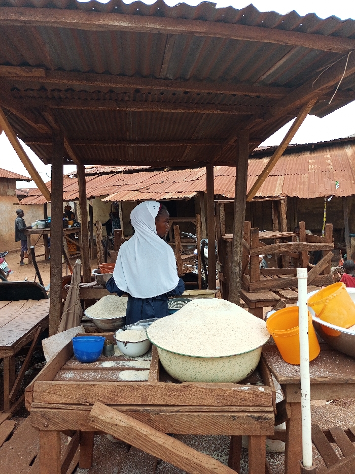 A woman wearing a white headscarf stands at an open-air market stall in Idah, Nigeria (coordinates: 7.11, 6.732). The stall is made of wooden beams and corrugated metal roofing. She is tending to a pile of white grain in a large white bowl. There are several smaller bowls of grain nearby. A blue plastic bowl and two orange plastic buckets are also on the table in front of her. There are wooden tables and chairs in the background, as well as a partially obscured metal motorcycle. Another person is visible walking away from the stall. The scene appears to be outdoors on a sunny day. The corrugated metal roofs of nearby buildings and a dusty, unpaved ground suggest that this is a casual, outdoor market.