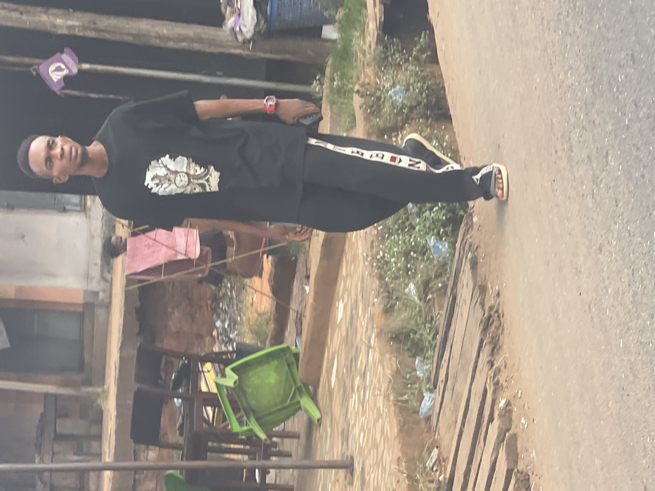 An outdoor scene in Nkpor, Nigeria, depicts a young adult male walking on a paved road surface, moving from right to left across the frame