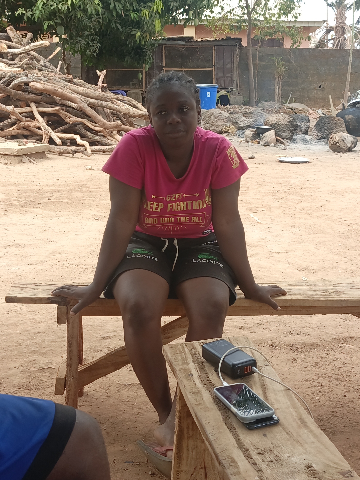 This image depicts an outdoor scene in what appears to be a residential or communal area within Akwanga, Nigeria; however, a precise location within the city cannot be determined from the visual information. A dark-skinned individual, likely female, is seated centrally on a rustic wooden bench, facing forward. She is wearing a pink short-sleeved t-shirt with partially visible yellow text including "KEEP FIGHTING" and black shorts featuring the "LACOSTE" logo. Her hands rest flat on the bench to either side of her hips. Red flip-flops are visible on her feet. In the bottom right foreground, a black power bank displaying "00" on its digital screen is connected via a white cable to a smartphone, both resting on a separate wooden plank. The ground is unpaved, composed of light brown earth. In the background, to the left of the seated person, is a large pile of cut tree branches and logs. To the right, an improvised outdoor cooking area is present, comprising stones arranged around a potential fire pit, a small metal bowl, and a dark pot. A white plate lies on the ground nearby. Sparse trees with green foliage and simple concrete block structures, one with a blue barrel next to it, are visible further in the background. A portion of a person's leg, clad in blue shorts, is visible in the bottom left corner, indicating another individual is present out of frame.