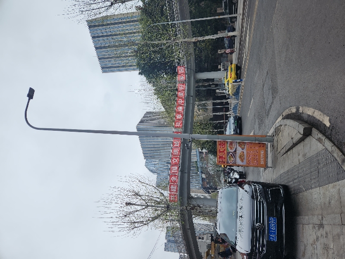 This image depicts an urban street scene in Yuzhong District, China, under an overcast sky. In the immediate foreground, a black Volkswagen SUV, bearing the license plate 渝A·16H9P, is parked on the grey paved sidewalk on the left. To its right, positioned on the edge of the sidewalk where it curves down to meet the road, stands a tall, slender grey lamppost equipped with a rectangular light fixture. Adjacent to the lamppost, an orange A-frame sign displays Chinese text and images of food items, likely advertising a restaurant menu. The road, visible to the right of the sidewalk, features yellow lane markings and white and blue plastic barriers separating traffic. A bright yellow sedan is visible on the right side of the road, with another lighter-colored sedan further down. Several motorcycles are parked along the street behind the black SUV. An elevated pedestrian overpass, constructed of grey concrete or metal, spans across the street in the midground. Red banners with white Chinese characters reading "共建全国文明城 共享美好家园" (Jointly build a civilized city, jointly enjoy a beautiful home) are prominently displayed along its railing. Indistinct figures of pedestrians are visible both on the overpass and on the sidewalks along the street. In the background, multiple modern high-rise buildings with distinctive vertical architectural elements rise into the sky, indicative of a dense urban environment. Scattered trees, mostly deciduous and with bare branches, are present throughout the scene, particularly near the buildings and along the street.