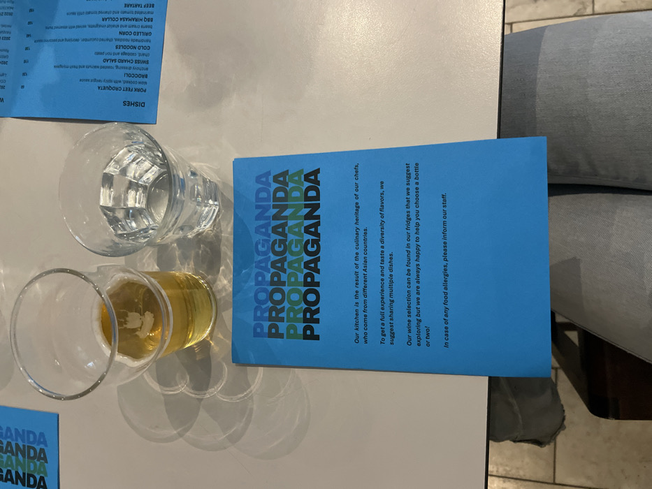 The image depicts a close-up, top-down view of a table setting at Propaganda, an Asian restaurant located at Vesterbrogade 39, 1620 Copenhagen, Denmark
