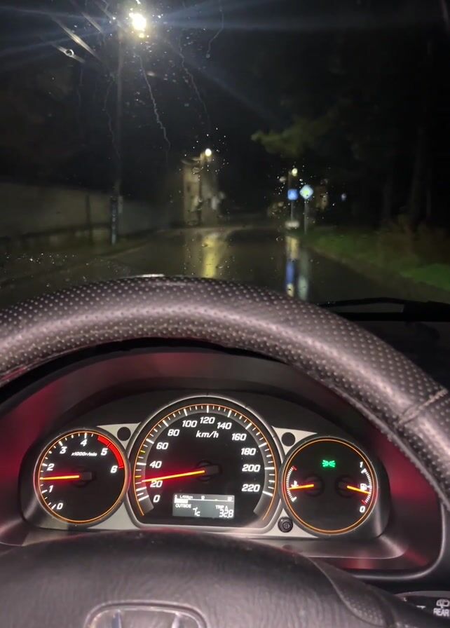 driver's perspective from inside a car moving on a wet road at night