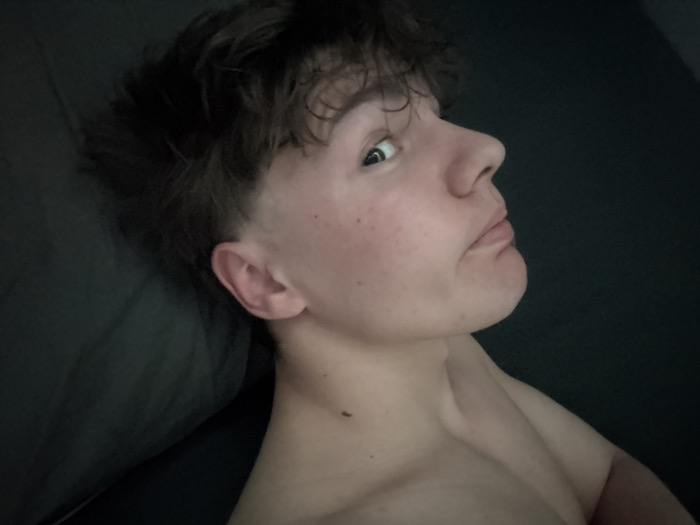 The scene is located in Troyan, Bulgaria. The image presents an inverted close-up view of a young individual, likely male, indoors. The subject's head occupies the lower portion of the frame, angled towards the left, with the face looking upwards. The left eye is open and directed towards the camera. The mouth is slightly ajar. The individual exhibits fair skin and dark, disheveled hair. A section of the bare upper torso, including a shoulder, is visible in the upper frame. The background consists of a uniform dark surface, consistent with bedding or a plain wall in a dimly lit interior environment.