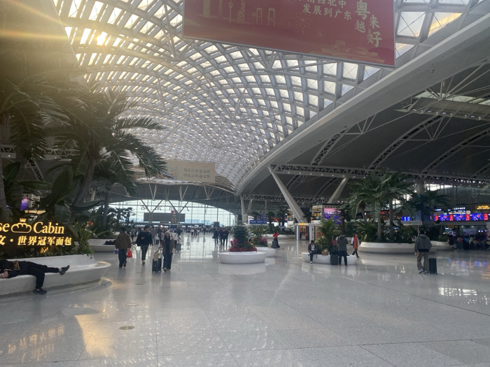 Inside a large, modern transportation hub, natural light streams through a geometric glass ceiling, illuminating a spacious hall. Palm trees are interspersed among seating areas. A person reclines on a bench near a "Rose Cabin" sign. People walk with luggage and casually stroll through the open area. Banners with Chinese characters hang overhead, with one including "发展到广东". Information boards and screens are visible in the background.