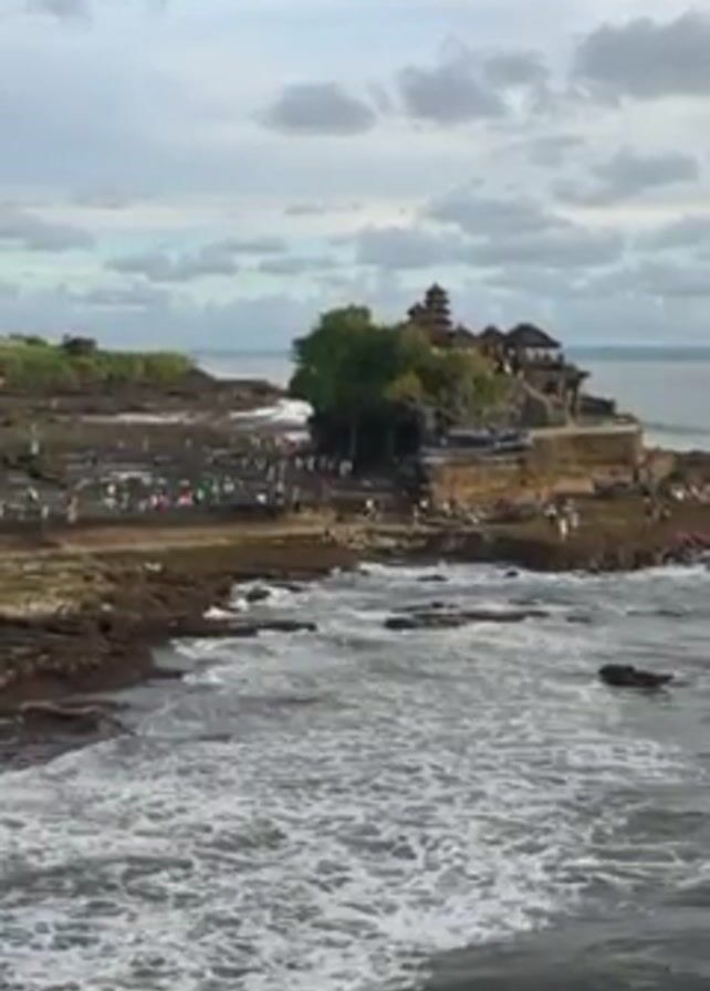 wide shot of the Tanah Lot temple in Bali, Indonesia, perched on a rocky outcrop surrounded by the ocean