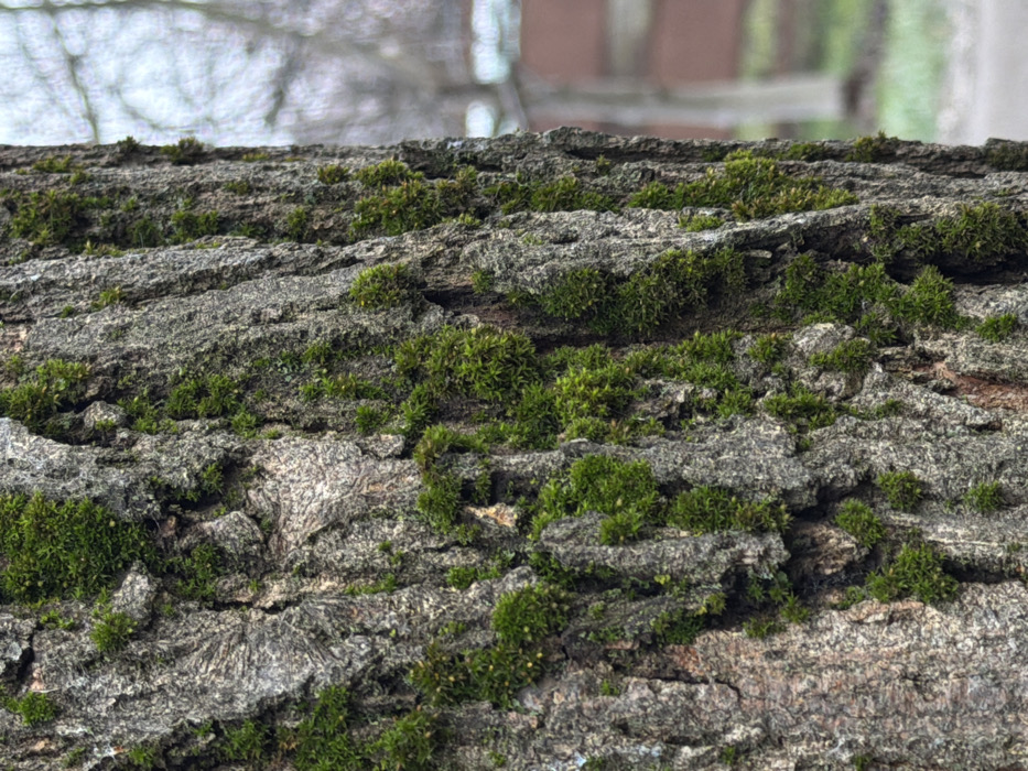 A vertical section of a tree trunk is depicted, located in the city of Yuzhny, Russia. The tree bark is textured with deep, irregular furrows and is predominantly grey-brown. Numerous clusters of vibrant green moss are growing on the bark's surface, particularly within the crevices. The background is significantly out of focus, showing blurred shapes consistent with distant vegetation and urban structures. No individuals, specific objects, or actions are identifiable in the scene.