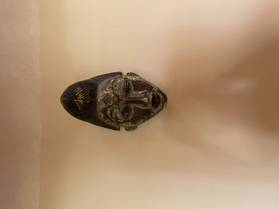 A dark brown wooden mask is centrally mounted on a light peach-colored interior wall in Kasoa, Ghana