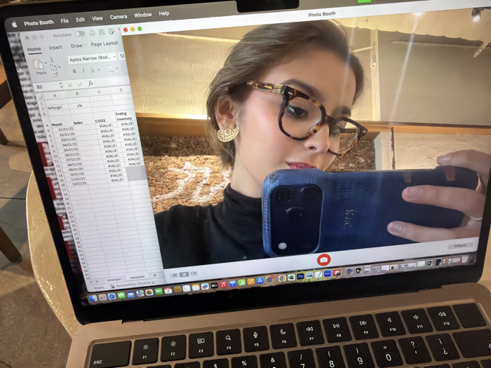 A woman in tortoise-shell glasses and gold earrings is taking a selfie with a dark blue iPhone case while working on a Macbook. The laptop screen displays Photo Booth and an Excel spreadsheet with columns for "Month," "% Margin," "Sales," "COGS," and "Ending Inventory." The spreadsheet contains various date entries and error messages "#VALUE!". The laptop keyboard is visible in the foreground, suggesting the photo was taken while the woman was working.