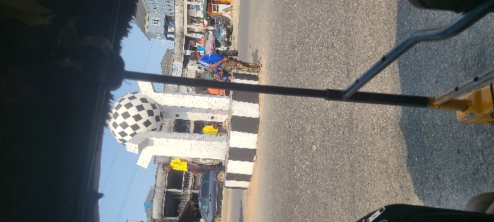 A low-angle shot captures a street scene from a vehicle. A checkered, spherical structure stands out, marked with black and white squares atop a white base with black and white stripes. People wearing blue and yellow shirts are visible near this landmark. The street shows ordinary cars and buildings in the background. The vehicle's parts, including metal bars and a yellow detail, frame the right side, while a dark, shadowy component occupies the left. The road dominates the lower section of the picture.