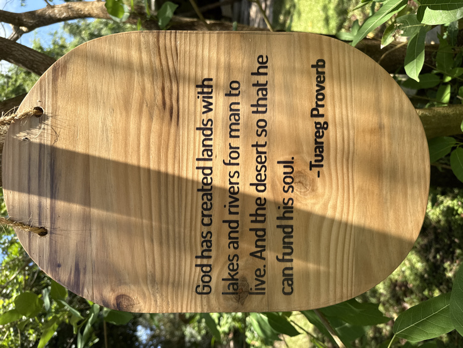An oval-shaped light-colored wooden sign is suspended outdoors by two strands of braided twine through drilled holes at its top edge. The sign bears black sans-serif text: "God has created lands with lakes and rivers for man to live. And the desert so that he can fund his soul. -Tuareg Proverb". The wood exhibits visible grain patterns and minor knots. Bright sunlight casts distinct shadows of tree branches and foliage across the sign and the background. The background consists of dense green foliage and tree trunks, indicating a natural, verdant environment. No individuals or specific actions are depicted. The scene is located in Kendwa, Tanzania.