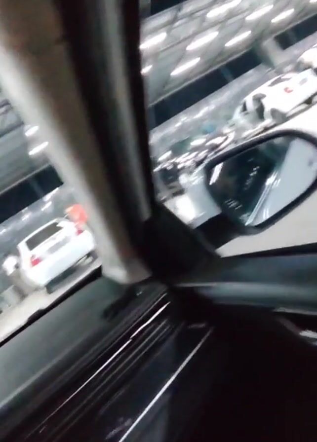 interior of a car, possibly at a car wash or detailing center. The dashboard, steering wheel, and side mirror are visible from the driver's seat perspective. Outside, several white cars are parked under bright, industrial-style lighting. People are seen moving around the cars, with some having their trunks open. A sign with an arrow and the word "HIQISH" is visible above the cars. The time displayed on the car's screen is 23:52.
