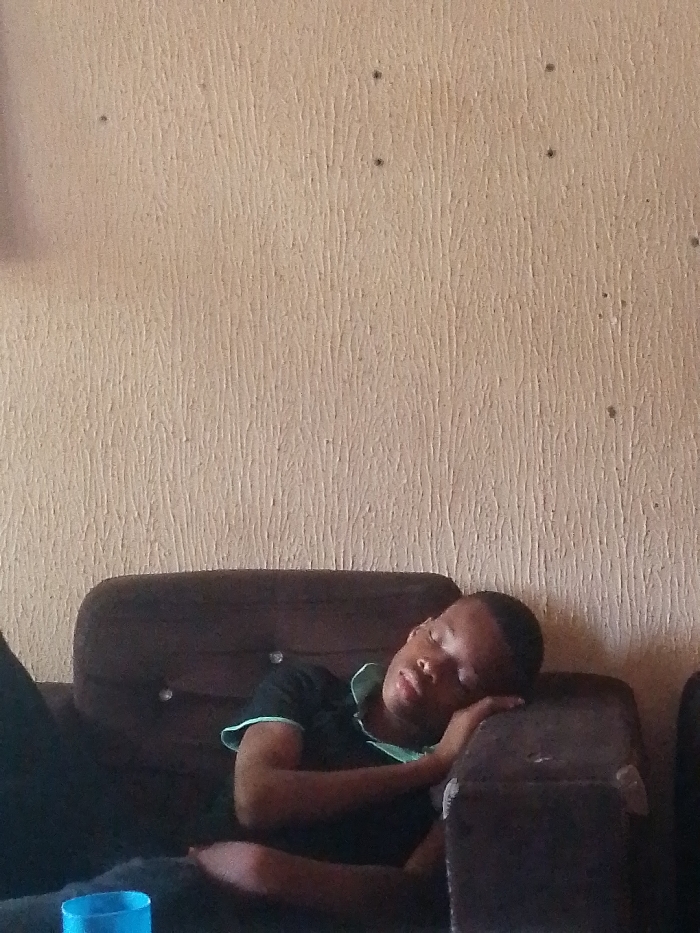 Interior location in the city of Unknown, Unknown. A young individual with dark skin, wearing a dark polo shirt with a light green collar and sleeve trim, is depicted resting or sleeping on a dark brown upholstered sofa or armchair. The individual is lying on their right side, head supported by the sofa's armrest, with eyes closed. Their right arm is bent, hand near the head, and the left arm rests along their side. A light blue plastic cup is visible in the lower-left foreground. The background consists of a light beige or tan wall with a textured finish, exhibiting several small, dark circular marks.