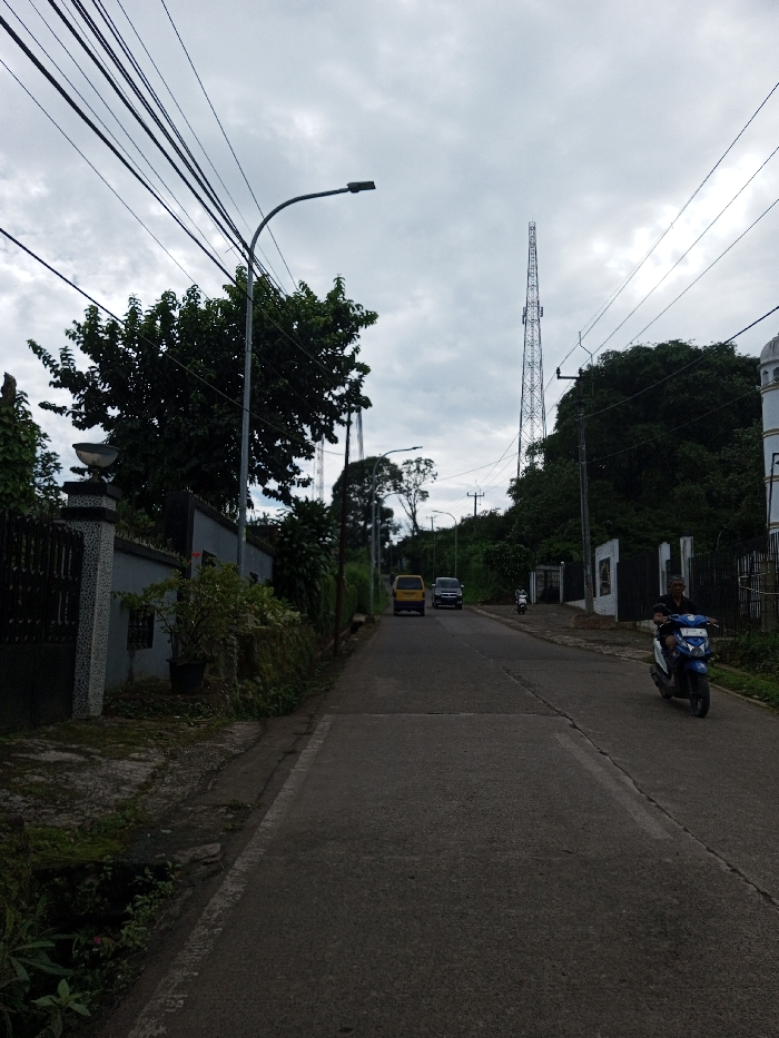 The image depicts a daytime street scene in Ariyalai, Sri Lanka, under an overcast sky. The primary subject is a paved, two-lane asphalt road that ascends gently from the foreground into the distance. A continuous white line marks the left edge of the road. On the road, a male individual is operating a blue scooter, positioned on the right side and moving away from the viewer. Further up the road, on the left side, a yellow sport utility vehicle (SUV) or van is visible, followed by a dark-colored SUV behind it, both also moving away. A smaller, white scooter is dimly visible in the distance on the right side of the road. To the immediate left of the road, a low concrete wall topped with decorative spires or protective elements runs alongside. Behind this wall, lush green foliage and trees are present, along with a black metal gate. A street light pole with a curved arm extends over the road. Multiple overhead utility wires traverse the upper portion of the frame. To the right of the road, dense green vegetation covers an elevated area. A tall, silver-colored lattice telecommunications tower rises prominently above the trees in the mid-ground. Part of a white, column-like structure is visible on the far right, partially obscured by foliage. Another street light pole is present further down the road on the right. The overall environment suggests a residential or semi-urban area characterized by vegetation and infrastructure.