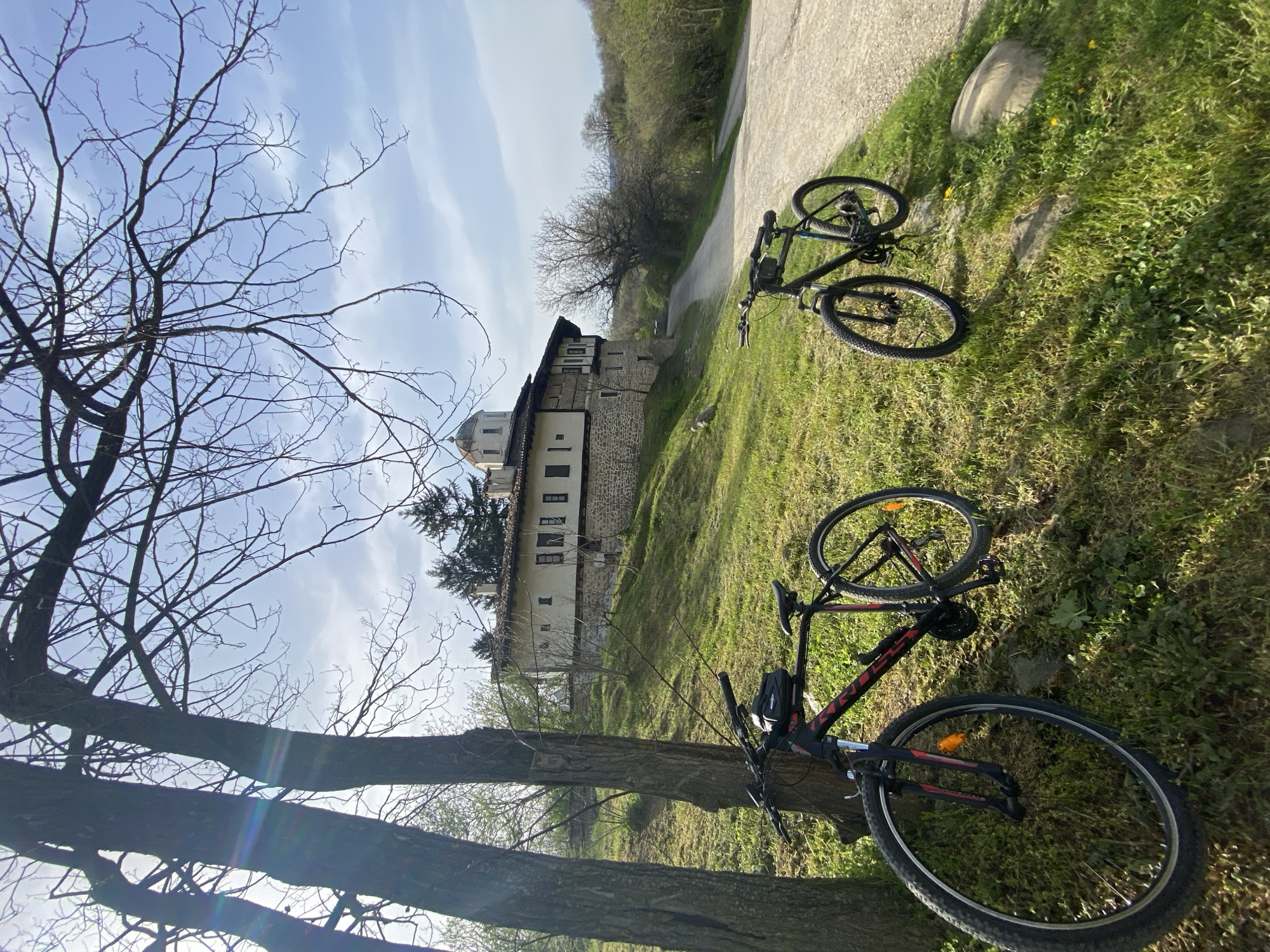 landscape in Pchelishte, Bulgaria. A stone building with a dome is visible in the background, possibly a monastery or church. Two mountain bikes are lying on the grass, one black and one black and red. A paved road leads past the building. A bare tree is in the foreground on the left. The sky is blue with wispy clouds. The scene is set during daylight.