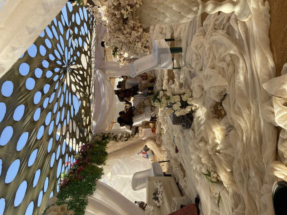 An outdoor event is depicted in Kuru Dungus, Nigeria, under a dark, circular-perforated canopy allowing dappled sunlight to illuminate the scene. The ground is light brown earth, largely covered by crumpled, light beige sheer fabric. White fabric drapes form temporary walls and ceiling elements. Artificial floral arrangements are prominent, including green foliage with pink accents hanging from the upper left, white floral clusters on a white armless sofa to the left, and a tall white decorative urn filled with white flowers on the right. A bouquet of white roses rests on a dark, possibly sequined, cylindrical stand on the floor. Several individuals, primarily women in patterned clothing, are seated at white-clothed round tables in the mid-ground, engaged in social interaction. White slipcovered chairs are scattered throughout the area. A person on the far left holds a clear plastic bottle. A black bucket is partially visible in the bottom-left foreground.