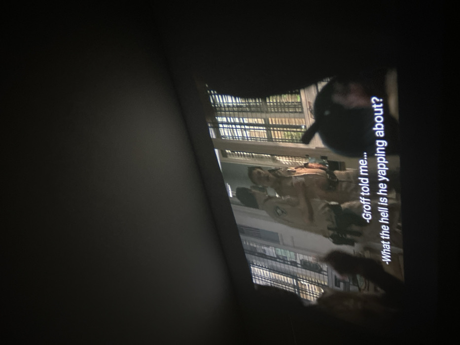 The image displays a video projection on a screen or wall within a dimly lit room in Cachan, France. The projected content features two men, possibly in light-colored uniforms with dark belts and holsters, standing indoors. The man on the left appears to be speaking to or interacting with the man on the right, who faces slightly forward. Behind them, a large window or glass door with horizontal blinds or grates is visible, admitting ambient light. Subtitles are overlaid at the bottom of the projection, stating: "-Groff told me..." and "-What the hell is he yapping about?". In the immediate foreground, dark silhouettes of at least two individuals are visible, indicating an audience viewing the projection. A silhouette on the left shows a raised arm and pointing finger directed towards the screen. Another partial silhouette on the right obscures a portion of the projection.