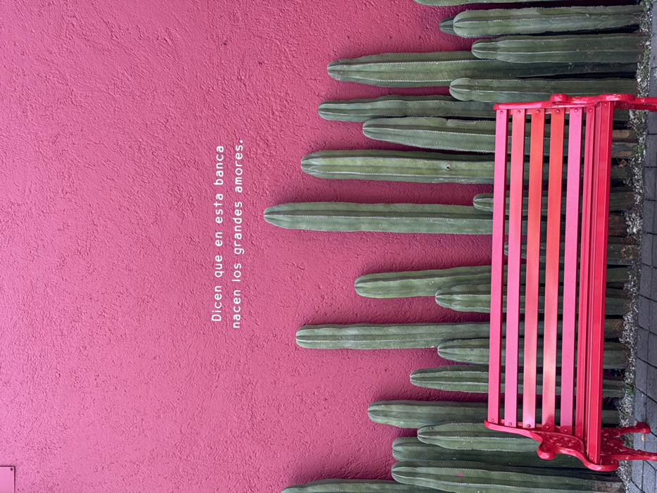 A fuchsia wall is juxtaposed with a row of spiky, green cacti arranged horizontally. A red bench with pink-hued slats is placed next to the cacti. In the center of the wall, rotated perpendicularly, is the text "Dicen que en esta banca nacen los grandes amores" (They say that on this bench great loves are born). A small section of gray pavement is visible on the right side of the image.