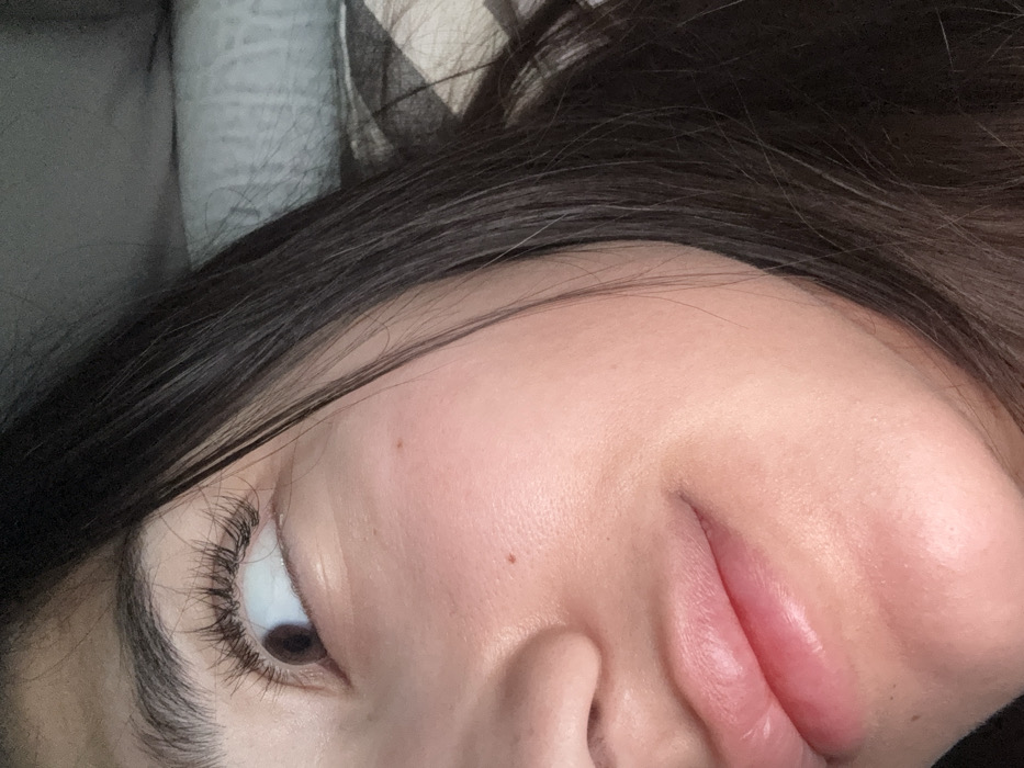 A close-up shot focuses on the face of a person with dark hair and a fair complexion. The person appears to be lying down, with a portion of a pillow visible in the background. One eye is prominently featured, revealing long eyelashes. The person's lips have a pronounced shape and are slightly parted. Small moles are visible on the cheek. The overall impression is a casual, intimate portrait.