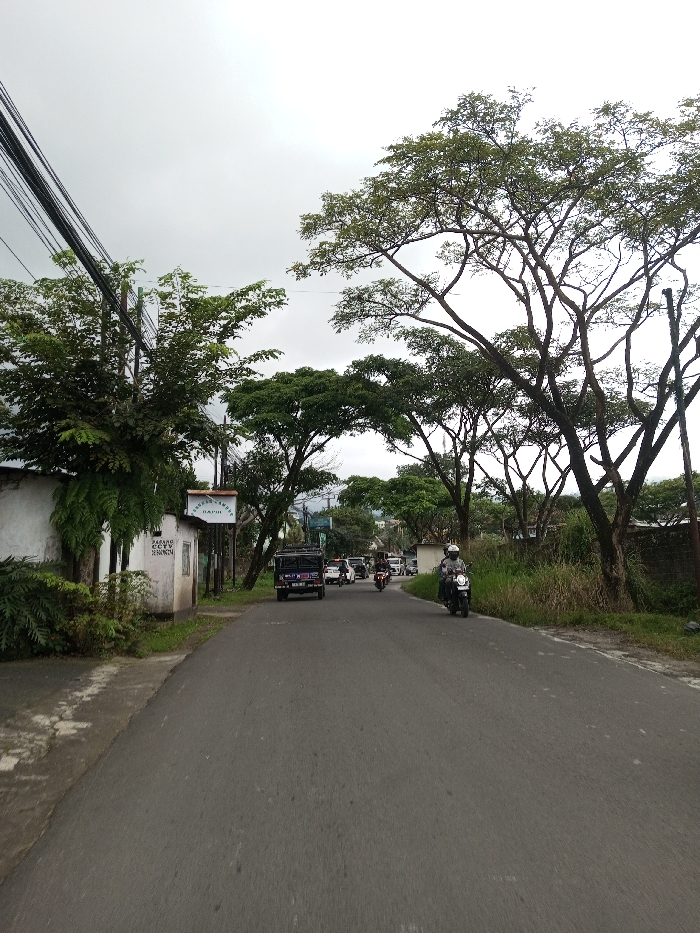 A street scene unfolds beneath a cloudy sky, bordered by verdant trees. Power lines stretch across the upper left. Vehicles, including motorcycles and a small truck, navigate the asphalt road. A small building with lush greenery and signage sits to the left, while vegetation lines the right side of the street. The road leads into the distance, where more vehicles are visible.