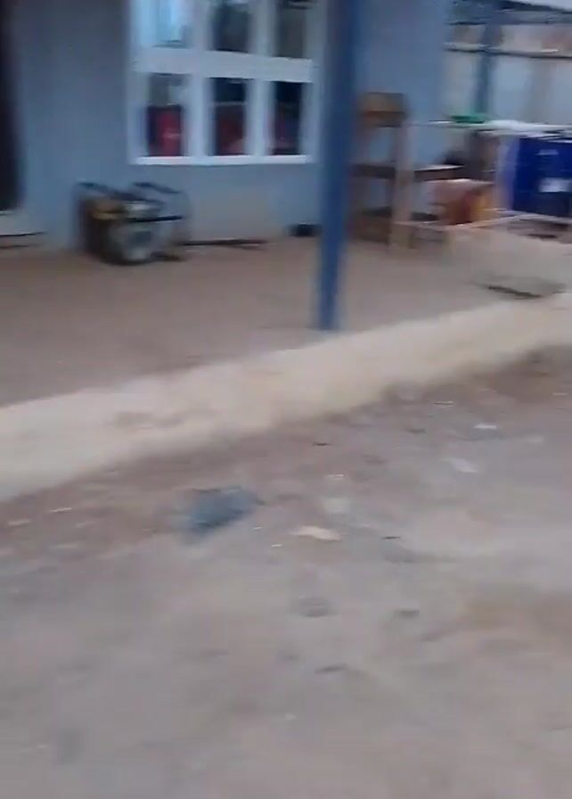 The camera moves across a dusty, gravelly ground under a structure, likely a shed or awning. Several blue and red barrels are visible in the distance. The quality of the video is poor. At the beginning of the video, a portion of a building with a dark door and windows is visible. The end of the video includes a partial view of a chain-link fence.