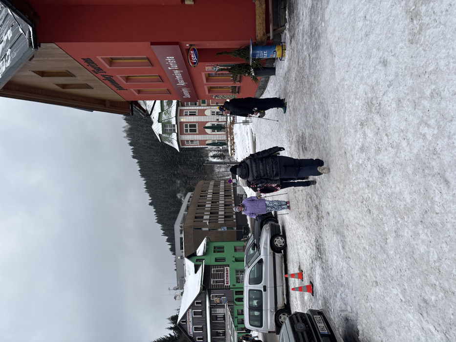 The image depicts a winter street scene in Velká Úpa, Czechia, under an overcast sky