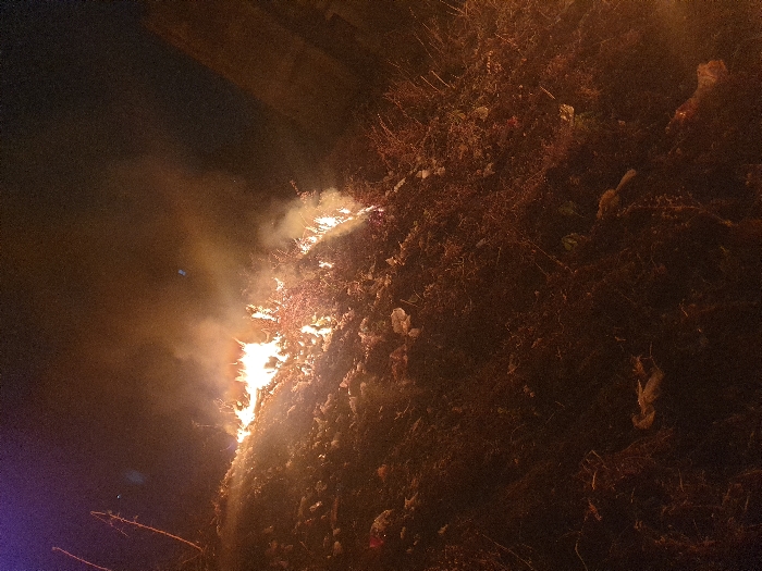 A dark scene shows a hillside ablaze with fire and smoke. Flames lick upwards from the terrain on the left. The fire burns amidst a thick mass of dry vegetation and scattered debris. The right side of the frame is predominantly dark with only faint indications of the hillside's texture and scattered objects. A dark shape, possibly an overhanging structure, appears in the top left corner. A hint of bluish light is visible in the bottom left.