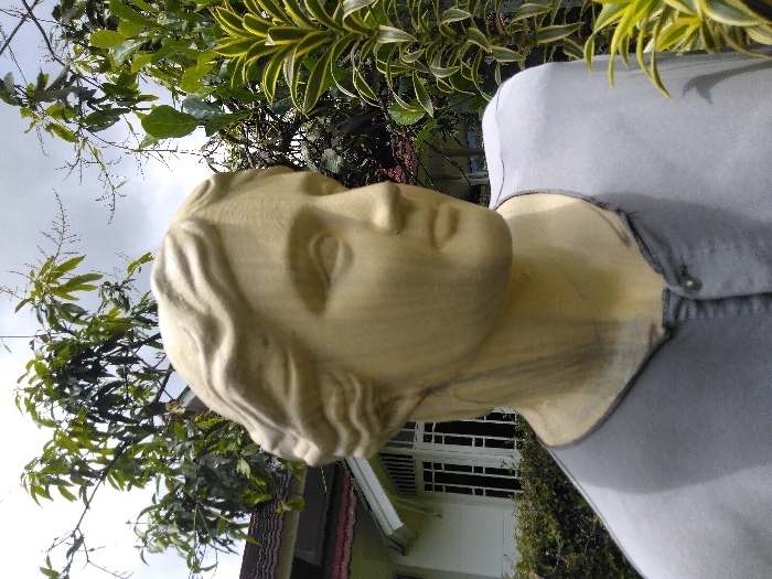 The image displays a light-colored bust statue, appearing to be crafted from stone or concrete, representing a classical female figure with wavy hair