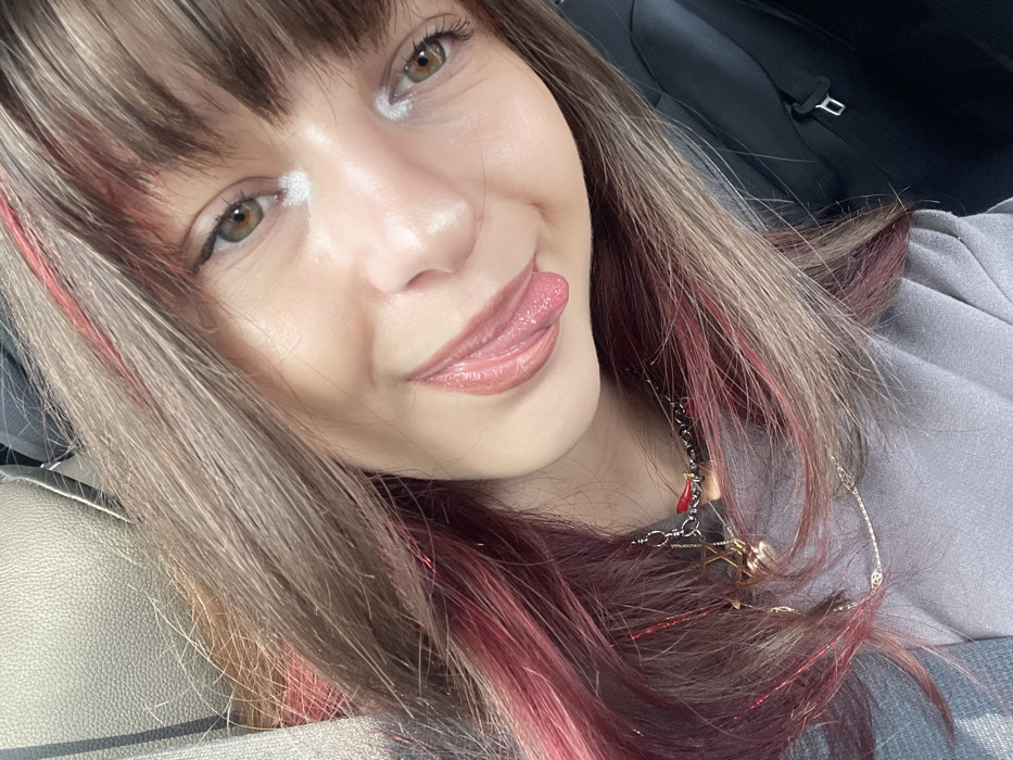 The image displays a close-up, angled portrait of a young individual, likely female, within the interior of a vehicle in Hod HaSharon, Israel. The subject has medium-brown hair with reddish-pink highlights and bangs, framing a face with brown/hazel eyes. Eyeliner is applied to the upper eyelids, and white pigment is present at the inner corners of the eyes. The individual's mouth is slightly open, with the tongue extended and visibly curled. Multiple necklaces are worn: one features a silver-toned chain with a small red horn-shaped charm and additional light-colored charms, while another is a finer, gold-toned chain with a star-shaped pendant. A light gray garment is visible on the subject's upper body. The background consists of light-colored, possibly upholstered, vehicle interior elements to the left and darker vehicle interior components to the right. The subject is looking directly at the camera with a playful expression.