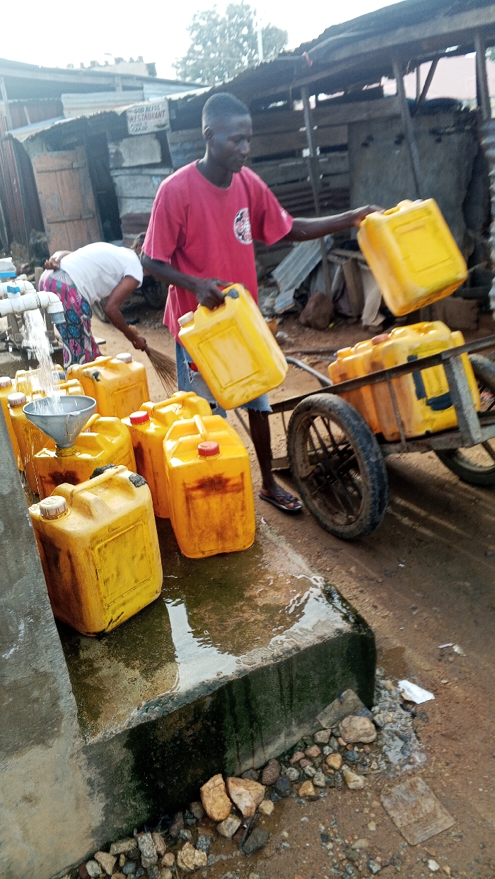 The image captures an outdoor water collection point in Adankolo, Nigeria
