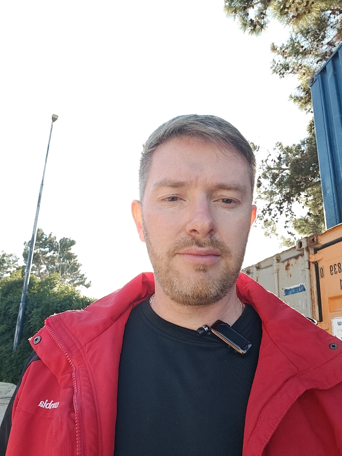 A fair-skinned male subject with light brown hair and a trimmed beard is depicted outdoors in Nesher, Israel. He faces the camera directly with a neutral expression, wearing a red zip-up jacket over a black crew-neck shirt. A black and brown electronic device, resembling a lapel microphone or Bluetooth earpiece, is clipped to his shirt. In the background to the left, a tall, grey street light pole extends vertically. To the right, a partial blue shipping container is stacked upon a full-height orange/tan shipping container, which displays faded white alphanumeric markings. Trees are visible in the background on both sides of the frame against a bright, overexposed sky.