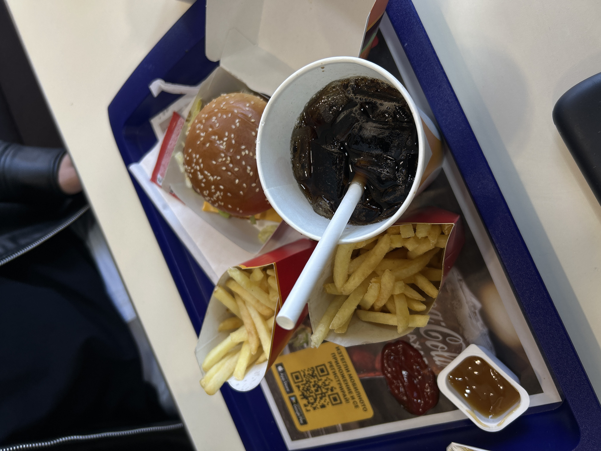 A tray holds a burger, fries, and a soda. The burger is in a box, topped with sesame seeds. Two portions of fries are in paper containers. A white straw sticks out of the soda cup filled with ice and a dark liquid. Ketchup and barbecue sauce portions sit near the fries. A QR code is visible on the tray. A part of a dark jacket and a smartphone are near the tray.