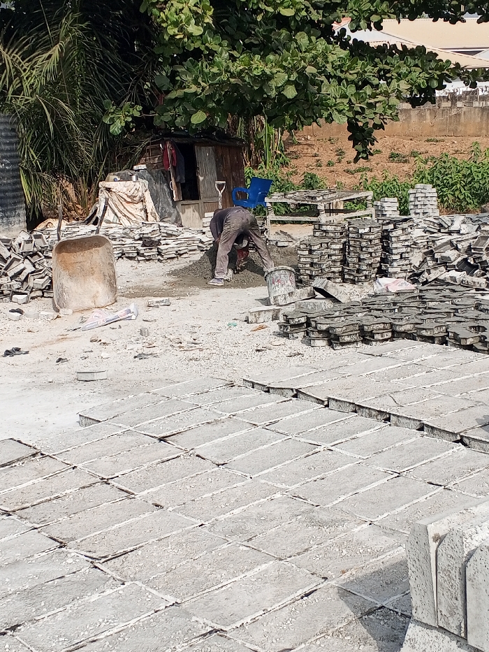 This image depicts an outdoor concrete block production site in Karu, Nigeria, under daylight conditions