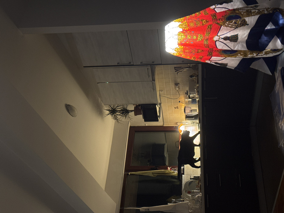 A rotated view of a kitchen features dark cabinets, a tiled backsplash, and a colorful lampshade overhead. A houseplant sits near a window, and a black cat is stretched up against the cabinets. Other kitchen appliances are visible on the counter. The room has an overall dark tone.