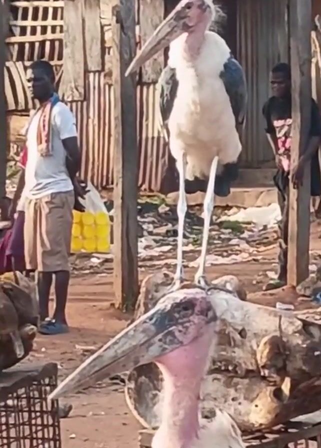scene in what appears to be a rural or less developed area with two Marabou storks present
