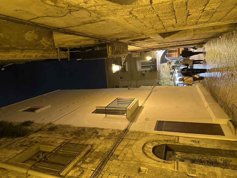 - "This image depicts a narrow, wet cobblestone alleyway at night in Bari, Italy, illuminated by warm-toned artificial light" by FM-7j8jj2, licensed under CC BY 4.0