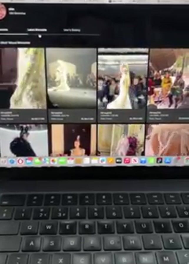 person scrolling through a web page on a laptop. The web page appears to be an image gallery, with each image depicting a fashion show or runway event. The images showcase models wearing various outfits. The laptop keyboard is visible in the foreground.
