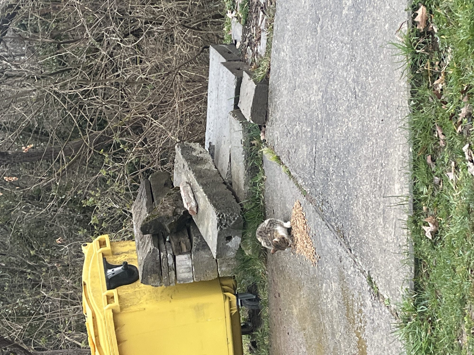 A domestic cat, exhibiting brown, white, and grey tabby markings, is crouched and consuming dry kibble scattered on a damp, grey concrete pavement. The pavement features a visible seam running through it. To the left and slightly behind the cat, a large, yellow wheeled waste bin is partially visible, featuring a black rectangular opening for depositing refuse. Adjacent to the waste bin, a stack of grey concrete blocks and slabs is present, some appearing broken or irregularly shaped. One of these blocks has a reddish, possibly organic, material resting on its top surface. The immediate foreground shows a strip of green grass containing some scattered dead leaves. The background consists of a dense thicket of bare, tangled tree branches and shrubs, with sparse indications of nascent green foliage, suggesting a late winter or early spring setting in Gabrovo, Bulgaria. The lighting is diffuse, consistent with an overcast sky.