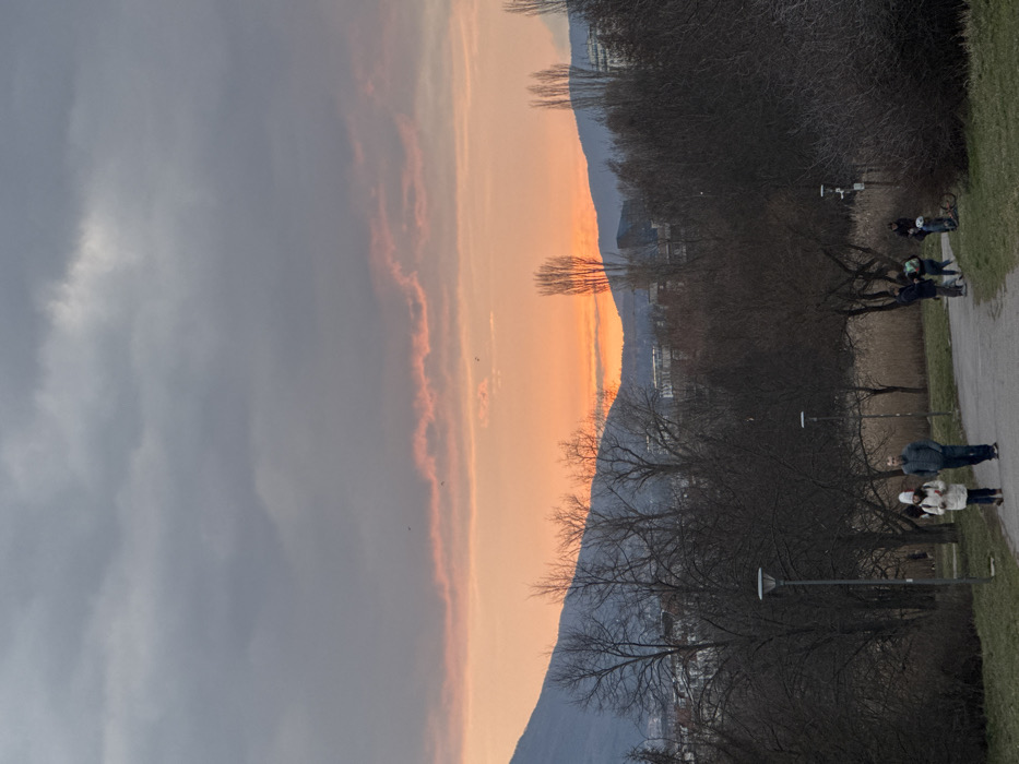 The image captures a sunset scene within South Park (Yuzhen Park) in Sofia, Bulgaria, with the Vitosha mountain range visible on the horizon. The upper sky is dominated by dark grey overcast clouds, while the lower sky displays a vibrant horizontal band of orange and pink hues, indicative of sunset. Several small, dark birds are visible in flight against the illuminated sky. In the background, the dark, undulating silhouette of Vitosha mountain spans the horizon, with various residential and urban buildings partially visible below its peaks, appearing as dark masses against the sky. The midground features a dense collection of leafless deciduous trees and shrubs, displaying bare, dark branches typical of winter or early spring. A paved, light-grey pathway, approximately two meters wide, curves from the foreground towards the midground. Two modern streetlights with circular heads stand at intervals along the left and central-right portions of the path. To the right of the path and beyond the shrubs, an area of dry, yellowish-brown reeds or tall grasses is visible. In the foreground, two individuals are walking on the path, moving towards the viewer. The person on the left wears a white beanie, a white jacket, and dark pants, holding a white object in their left hand. Beside them, an adult male wears a dark blue jacket, blue jeans, and light-colored shoes. Further down the path on the right side, a group of three to four individuals is standing near the path's edge; one person is clad in a bright green top, and a bicycle lies on the ground nearby. The immediate foreground consists of sparse green grass and bare earth.