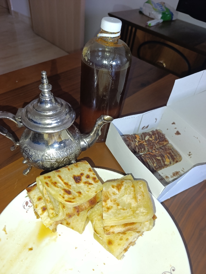 An indoor scene in Salé, Morocco, displays a meal spread on a brown wooden table. A white plate in the foreground contains several square-shaped, golden-brown flatbreads, consistent with Msemen, some exhibiting visible syrup or honey residue. To the left, an ornate silver Moroccan teapot rests on the table. Behind the teapot, a clear plastic bottle with a white screw cap holds a dark amber liquid. A partially open white cardboard box to the right displays two rectangular pastries topped with white icing drizzle and slivered almonds. The background features blurred wooden furniture and a light-colored wall, with a white plastic bag visible on a rear table surface.