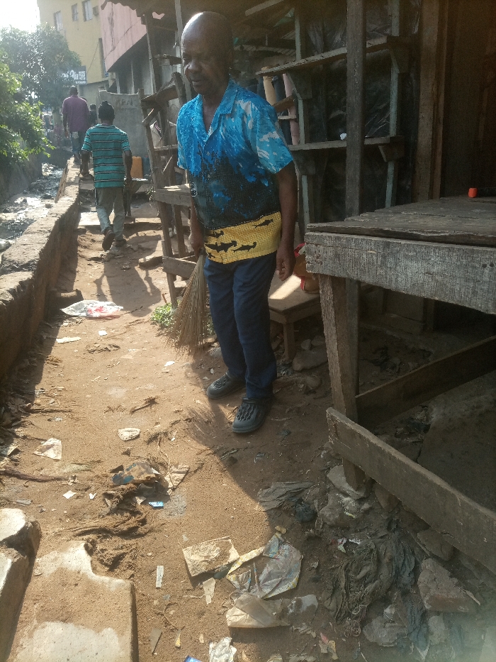 An elderly man sweeps dirt in a street next to wooden stalls. He wears a blue patterned shirt, dark trousers, and shoes. Two men walk away from the camera up a narrow path alongside a dirty trench. The ground is littered with trash and debris. The setting appears to be an outdoor market or a similar urban area.