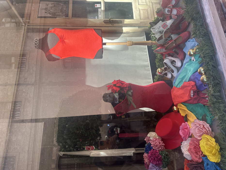 The image displays a storefront window in the city of Córdoba, Spain, exhibiting dance or performance wear