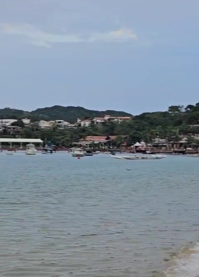 beach and bay filled with boats. Several boats of varying sizes and colors bob gently on the water, some with buoys nearby. In the background, a lush, green hillside is dotted with buildings, suggesting a populated area. The sky is overcast, and the waves are small. The video seems to have been taken on an overcast day, with calm, natural surroundings.