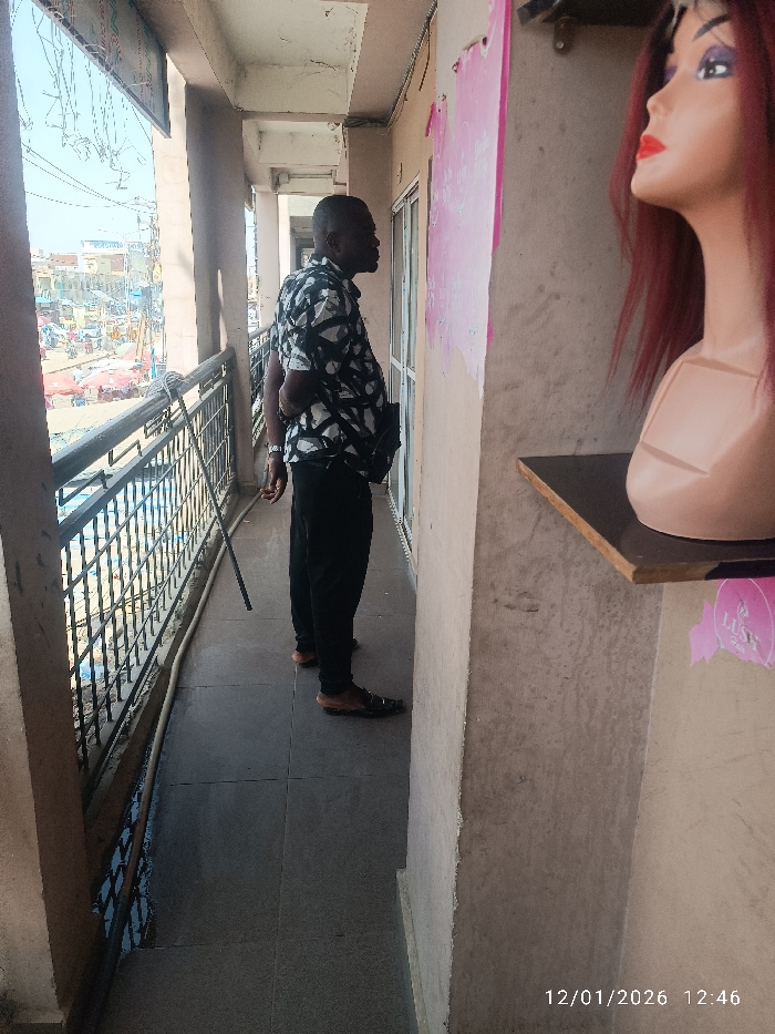 A forensic description of the scene in Sabon Gari East, Nigeria, on 12/01/2026 at 12:46, depicts an adult male standing on an outdoor tiled corridor or balcony of a building overlooking a busy street