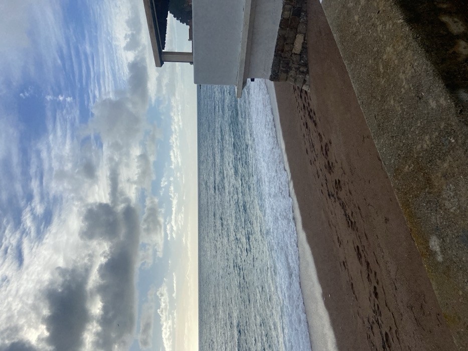 This image depicts a coastal scene in Petrovac centar, Montenegro. In the foreground, a rough-textured, dark grey concrete barrier or wall is visible, running diagonally from the bottom right towards the center. Immediately beyond this barrier, a reddish-brown sandy beach stretches across the mid-ground, showing numerous scattered footprints. White foamy waves are actively breaking and receding at the water's edge, meeting the sand. To the right, a multi-tiered building structure is partially visible. Its base consists of dark stone masonry, topped by a white-plastered wall with a flat concrete ledge. Above this, a wooden-beamed pergola or roof structure is present, suggesting an outdoor covered area. The building appears situated directly at the interface of the beach and the main concrete barrier. The background features the expanse of the Adriatic Sea, displaying a blue-green color with visible surface ripples extending to a distant horizon. The sky is largely covered by a mixture of grey and white clouds, with patches of lighter blue visible. A small, dark, unidentified object, possibly a bird, is discernible against the sky on the far left. No individuals are visible in the scene.