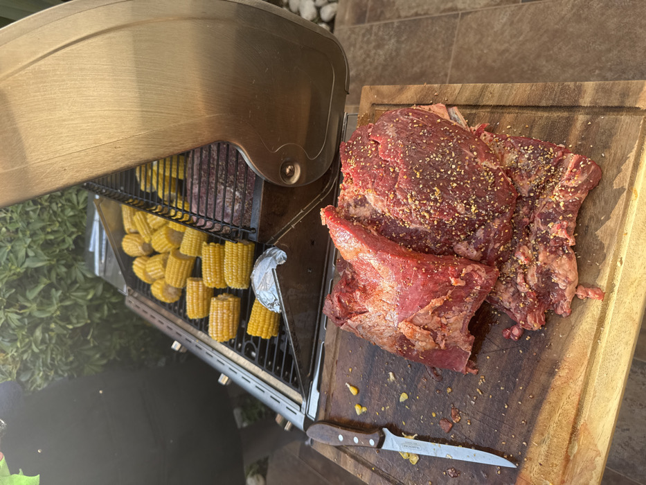 A grill with the lid partially open shows corn on the cob and meat cooking on the lower rack. Next to the grill, a seasoned cut of raw meat sits on a wooden cutting board. A knife rests near the bottom edge of the board. The scene appears to be outdoors, with greenery visible in the background.