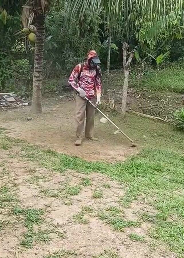 A person is using a weed wacker to trim grass. The person is wearing a long-sleeved shirt, pants, gloves, and a hat with a protective screen over their face. The person is standing in a yard with dirt and grass patches. There are trees and plants in the background. The weed wacker is making a buzzing sound and kicking up dirt and grass.