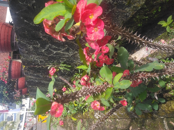The scene depicts an outdoor garden area in Cipanas, Indonesia. In the foreground and midground, multiple Crown of Thorns plants (Euphorbia milii) are prominently featured, displaying thorny stems, green oval leaves, and clusters of small, vivid red-pink flowers. These plants are positioned alongside a dark, textured concrete or stone wall that runs horizontally across the frame. Resting atop this wall are several reddish-brown terracotta pots, each containing additional flowering plants with red blossoms. The background reveals a building characterized by a red tiled roof and light-colored walls. To the left of the building, a white and red flag, consistent with the Indonesian national flag, is visible on a flagpole. The ground surface in the immediate foreground consists of soil, small stones, and some visible moss. No individuals are present, and no active interactions or specific actions are depicted.