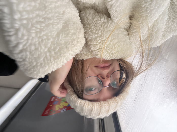A low-angle, close-up image captures a light-skinned female individual indoors, positioned next to a window. Her light brown hair, reaching her shoulders, frames her face. She wears round, wire-rimmed glasses with light-colored eyes visible through the lenses, and a cream-colored ribbed knit beanie. Her expression is neutral, with her gaze directed upwards and slightly to her left. She is dressed in a thick, textured, off-white or cream-colored sherpa-style jacket or coat. Her left hand is raised near her head, partially touching her hat. The window to her left is visible, covered in condensation or precipitation streaks, obscuring any exterior view. Above and behind her, to the upper right of the frame, a red object with yellow and green graphic elements, possibly a party hat or decorative item, is partially visible against a light grey overhead panel. The immediate environment suggests an interior space, likely within a vehicle such as a train or bus, or a room with a window, but a specific location within Борисово, Russia, cannot be identified from the visual evidence presented.