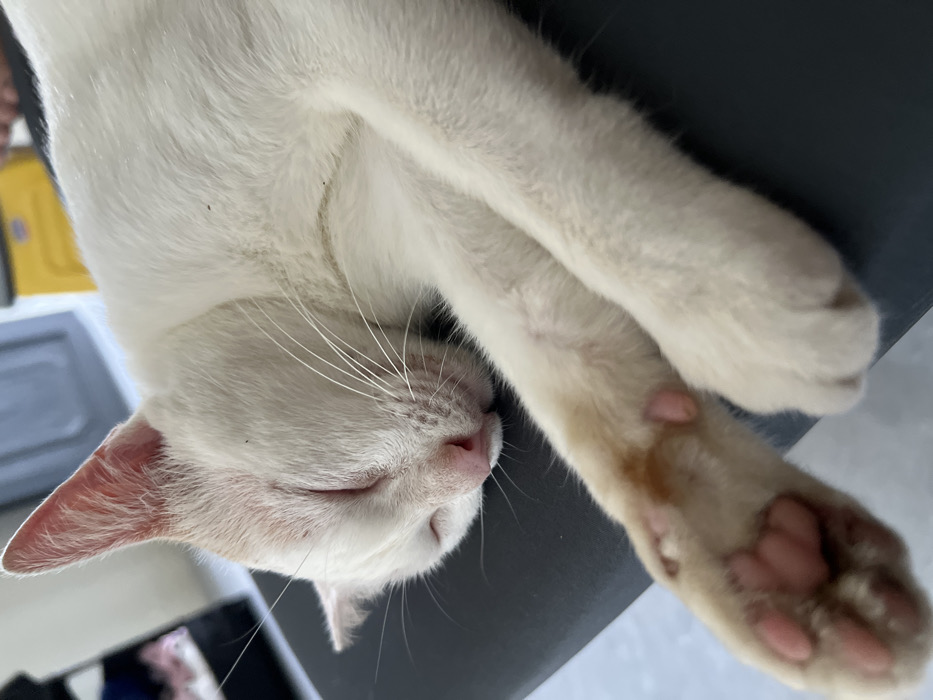 - "A white domestic cat is depicted sleeping on a dark grey, flat surface, situated in the city of Cam Đức, Vietnam" by FM-gZMgt2, licensed under CC BY 4.0