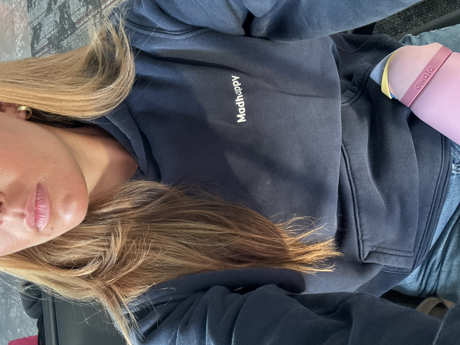 A woman's selfie displays her face, shoulders, and torso. She wears a navy hoodie with the word "Madhappy" printed vertically on the chest. Her blonde hair is styled loosely. A pink Owala water bottle rests on her lap. She is wearing jeans. An earring is visible in her left ear. The background shows a blurry gray patterned floor.